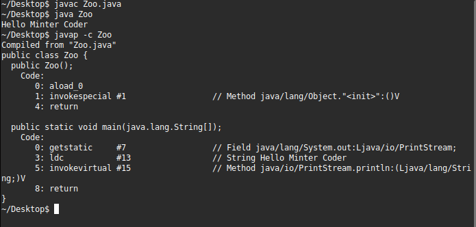 1) Biz "javac" aracı ile kodumuzu derleyip bytecode'ye çeviriyorduk. Bu dosya çıktı olarak bize Zoo diye bir dosya vardi normalde bu Zoo.class'tır yani bizim kodumuzun işletim sistemine değinmeden platformdan bağımsız çıkan bytecode'sidir. Bu bytecode'yi görüntülemek istersek eğer :