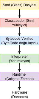 2) ClassLoader (Sınıf Yükleyicileri )'dan geçer : Kendi içerisinde Bootstrap vardır ve bu java.lang.Object, String gibi temel classları JDK'den yükler. Bir de Platform / AppClassLoader vardır burda ise bizim belirttiğimiz sınıfları CLASSPATH yada JAR'dan yüklemesini yapar.Örneğin biz String name = "MinterCoder"; yazdığımızda herhangi bir kütüphane eklemesi (java.lang.String) yapmıyoruz çünkü Bootstrap loader bunu bizim için kendisi yapıyor.
