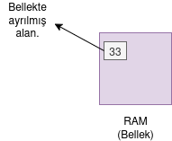 Görüldüğü üzere yukarıda bir değişken yazdık ve bellekte ayrılmış alanını da betimlemeye çalıştık. Yani kısacası bellekte veri için ayrılan bir alan olarak düşünün.