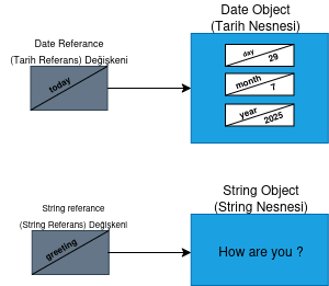 Unutulmamalıdır ki bizim değişkenlerde nesnelerimizin ismi yoktu yani String yada Date isimli nesnelerimizin ismi yoktur bunlar sadece bunlara uygun olan referanslar (today,greeting) tarafından erişilir.